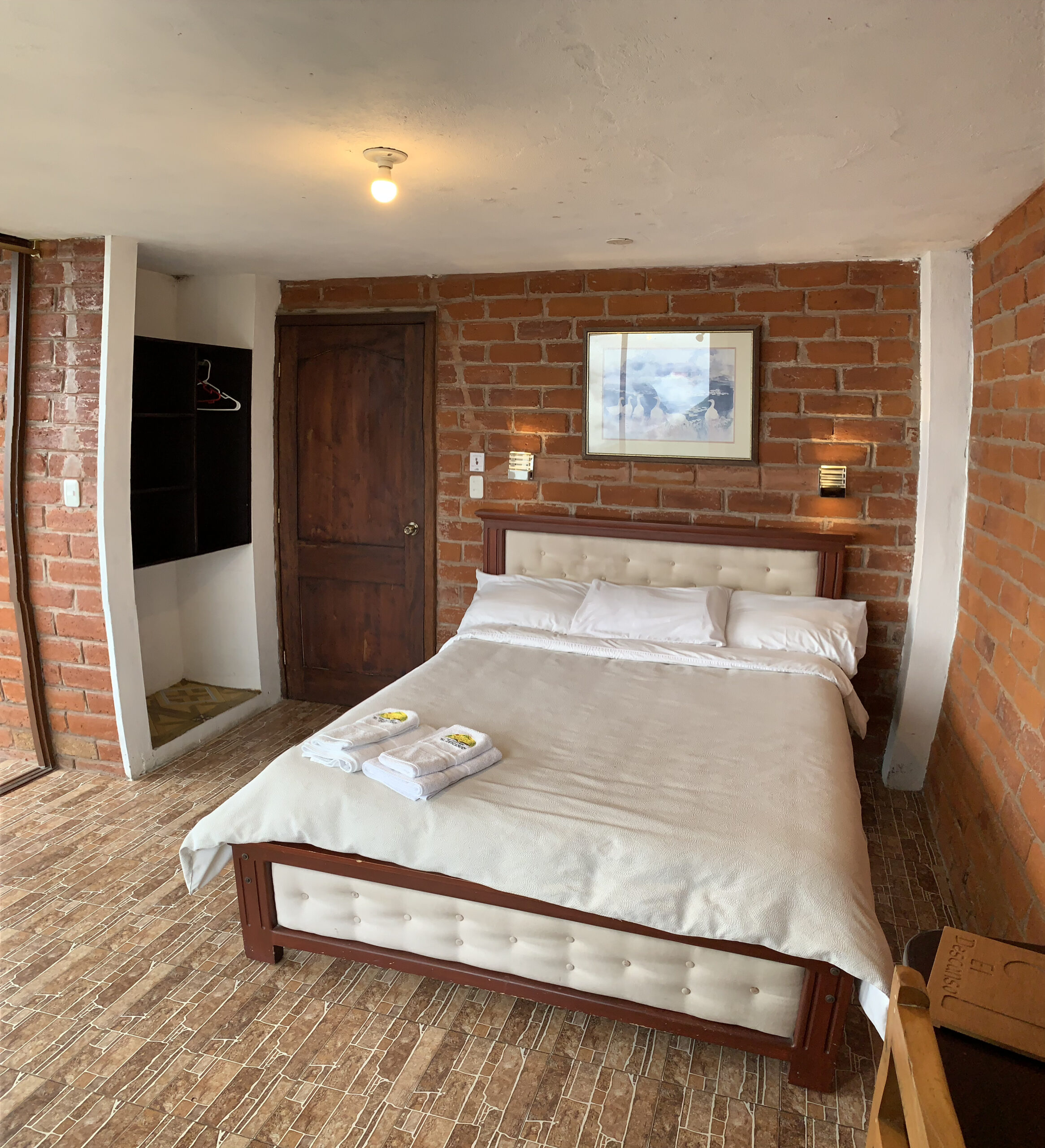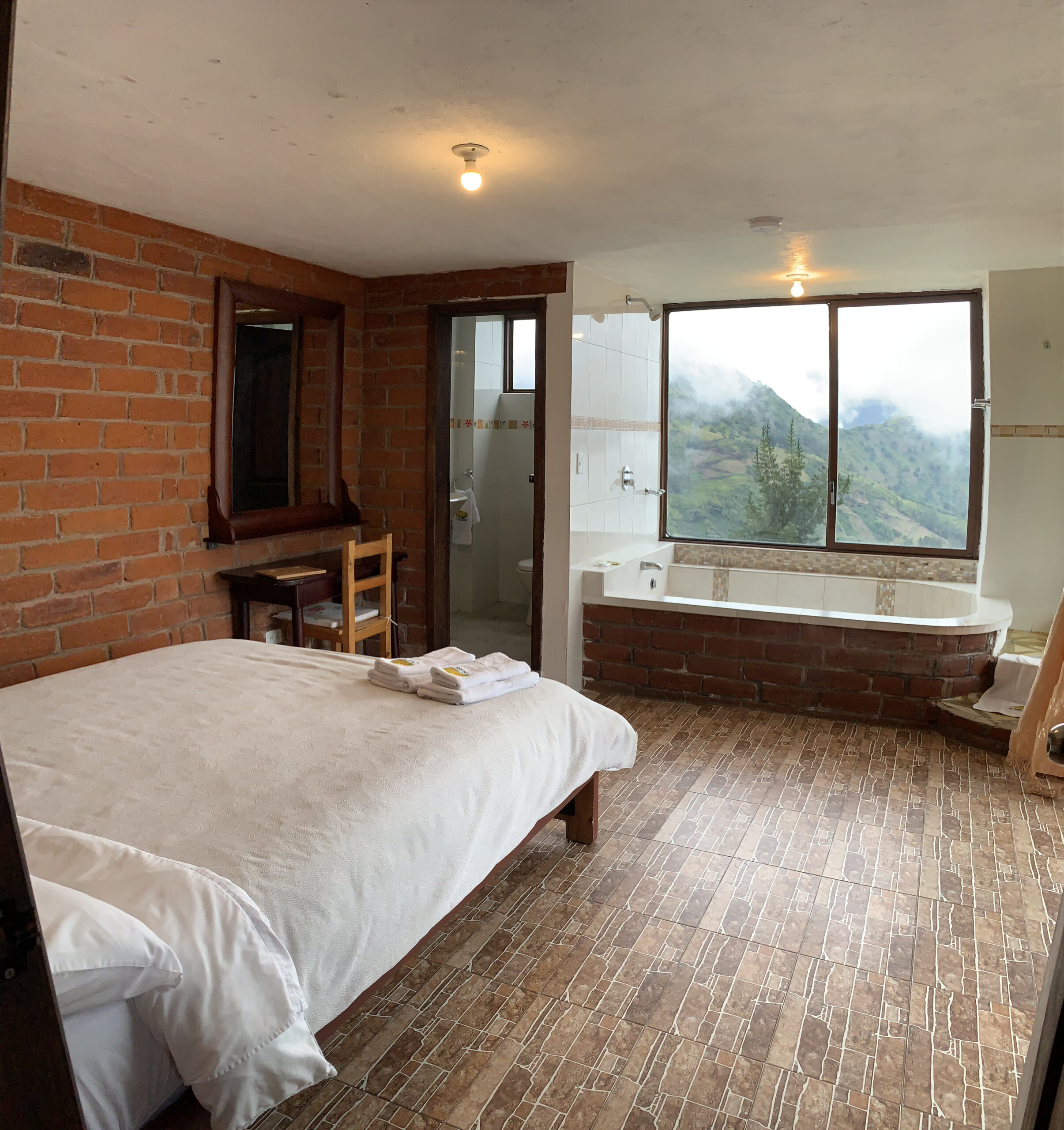 La Habitación Rocío ofrece un ambiente fresco y acogedor, inspirada en las mañanas de rocío que caracterizan a Baños de Agua Santa. Con decoración en tonos naturales, cama queen y baño privado completo, es perfecta para viajeros que buscan comodidad y tranquilidad a un excelente precio.