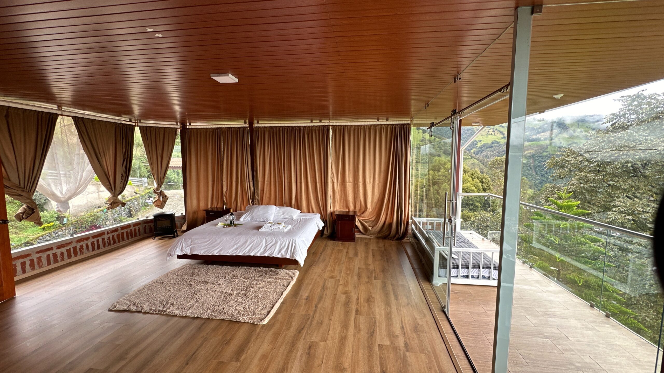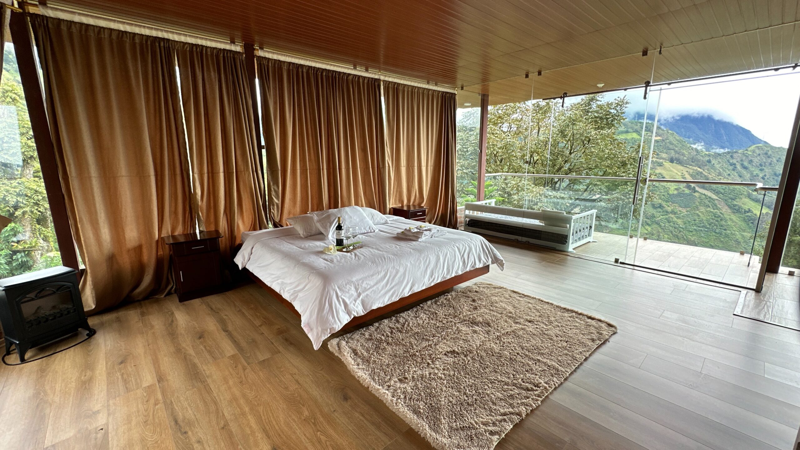 La Suite Amanecer captura la esencia de los primeros rayos de sol sobre las montañas de Baños de Agua Santa. Con decoración rústica elegante, cama king size y un balcón privado orientado al este, cada mañana será una experiencia inolvidable. Perfecta para parejas que buscan romance y tranquilidad.